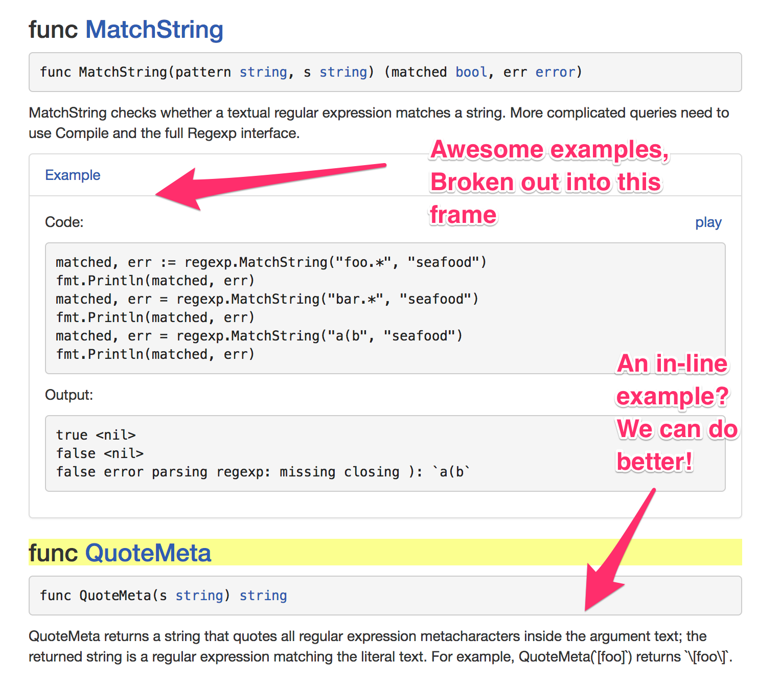 I have to say that Steve Francia challenged me to “find something that isn’t an open issue and fix it,” so I included some documentation changes for QuoteMeta in my patch. It’s going to be open for a bit longer given the additional scope, but I think it’s worth it on this one.