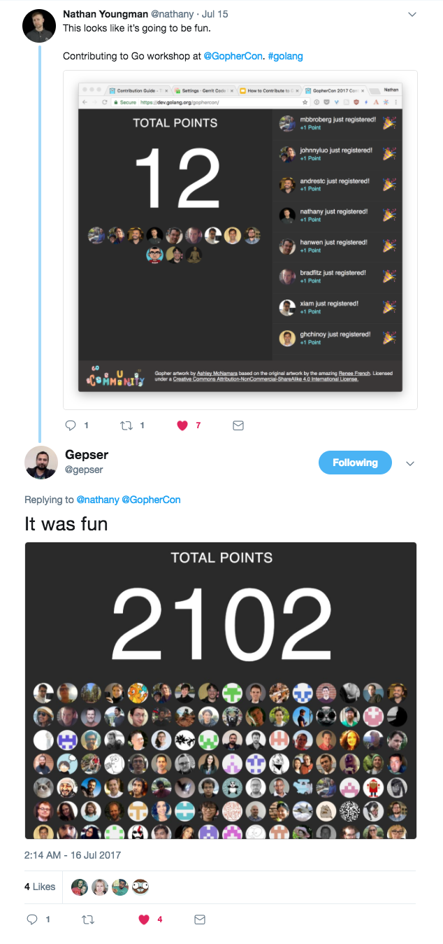 The event was successful well beyond our expectations. Sameer Ajmani, Go team manager said, “The contributor workshop was incredibly fun and educational–for the Go team. We cringed as users hit the rough edges in our process, and celebrated when they got up on the dashboard. The cheer when the group score hit 1000 was awesome.”