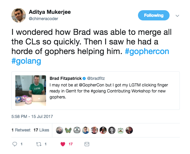 Brad Fitzpatrick, who stayed home from GopherCon this year, was ready and waiting to review all CLs submitted. He was so quick to review that many people thought he was an automated bot. Internally our team is now calling him “BradBot” mostly because we are in awe and a bit jealous.
