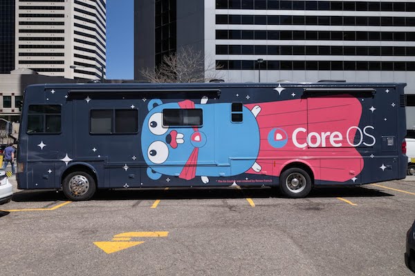 The gopher was also seen wearing a cape on the side of the incredible CoreOS bus: