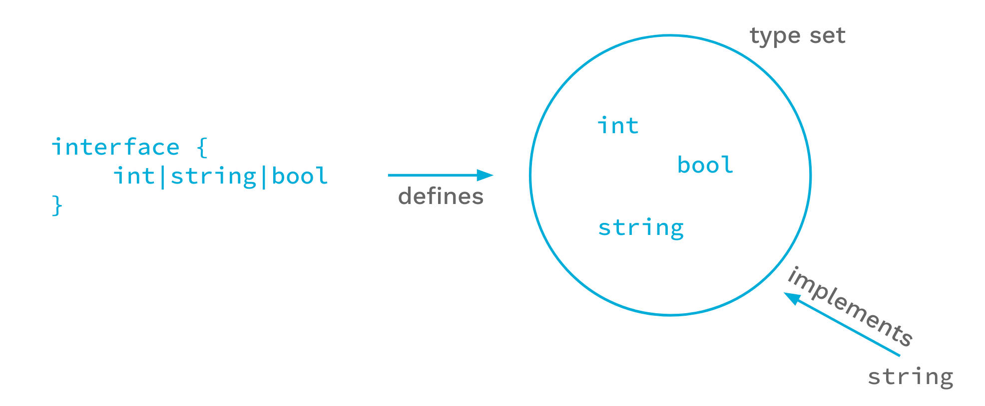 But another way of looking at this is to say that the interface defines a set of types, namely the types that implement those methods. From this perspective, any type that is an element of the interface’s type set implements the interface.